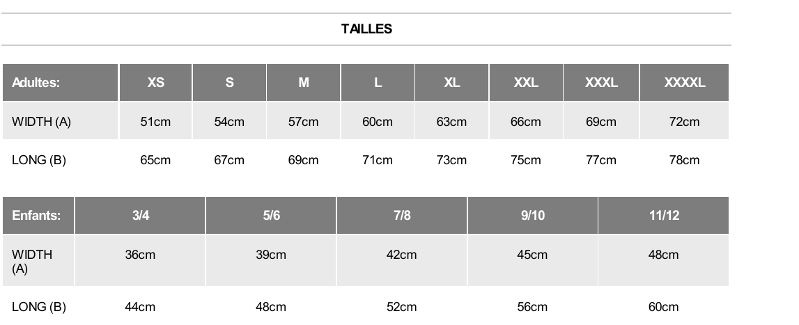 Tailles : S, M, L, XL, XXL, XXXL ainsi que des tailles enfants